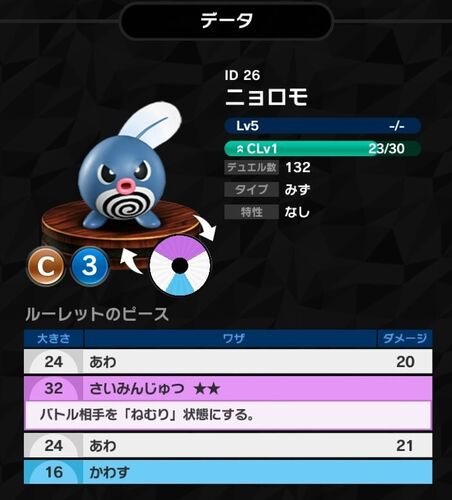 概要 ID 26 ニョロモ MP3 C ルーレットの初期ピース 24 あわ 20 28 さいみんじゅつ ★★ バトル相手を「ねむり」状態にする。 24 あわ 20 16 かわす 4 ミス コメント コマスター初期はオニスズメやルチャブルなどのコモンフィギュアが強かったで…